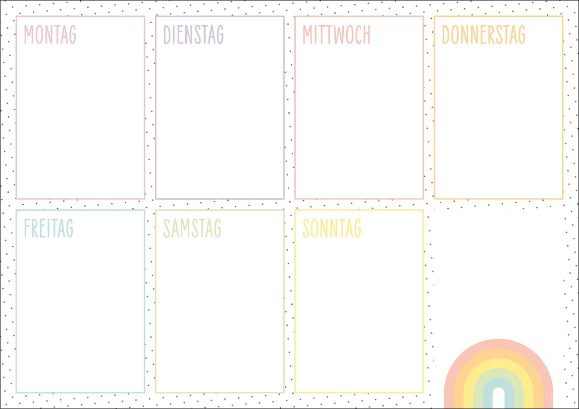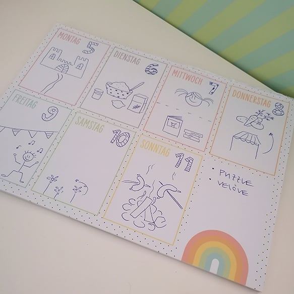 Neben den Wochentagen hat es genügend Platz um das Datum von Hand einzutragen. Oberhalb des Regenbogens hat Raum für Notizen, Spielwünsche usw.