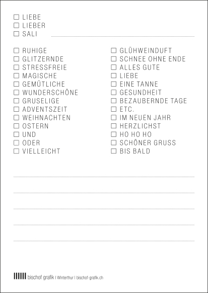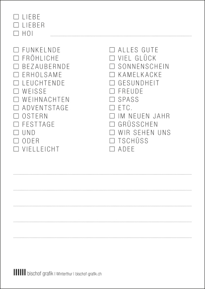 … für eher schreibfaule oder Gipshände – nur ein paar Kreuze setzen und schon entsteht ein individueller Text. Du entscheidest ob klassisch, lustig, cool oder gemein.